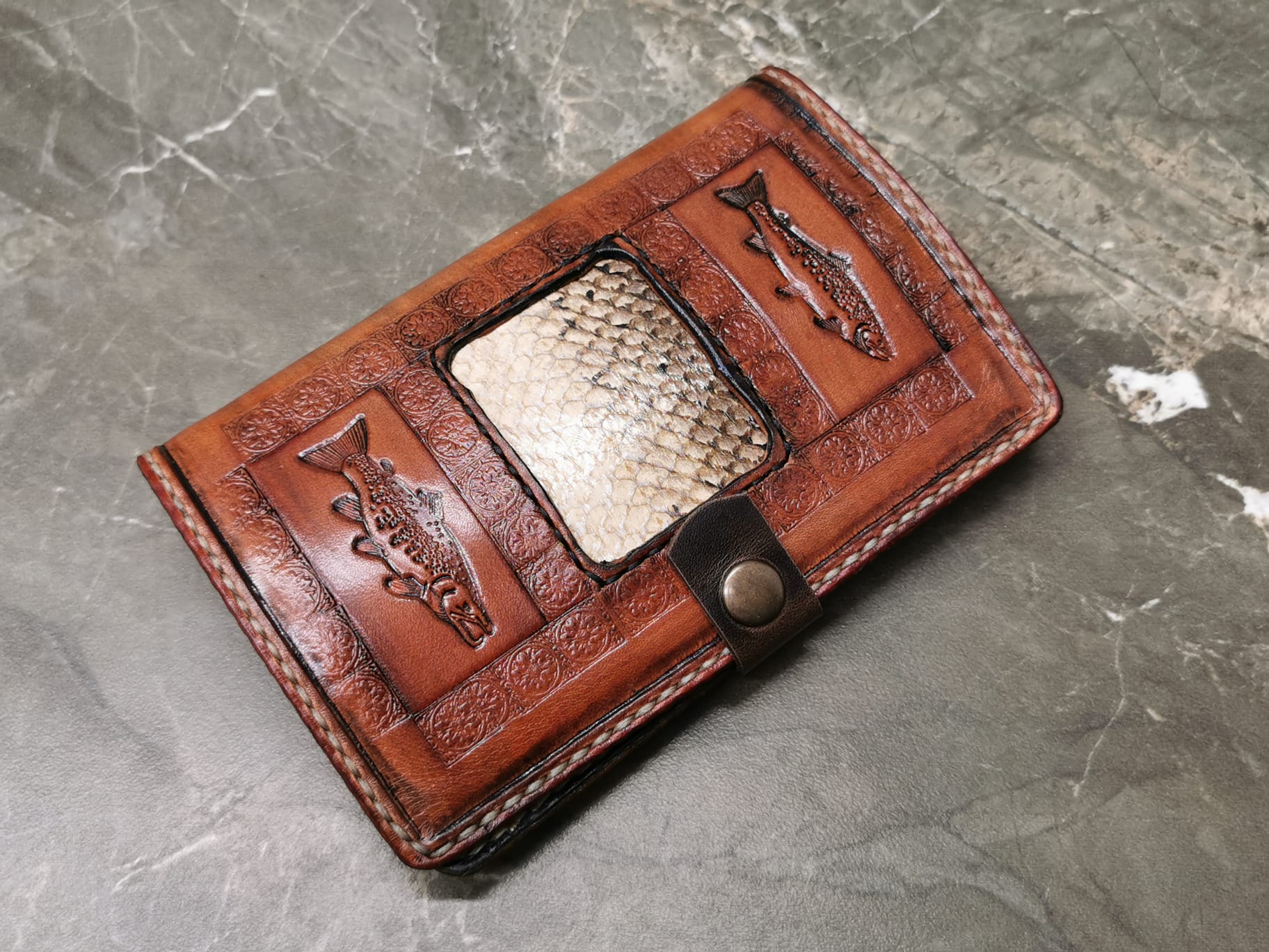 Lekker tubefluemappe i lær, laks utskjeringer samt detaljer med ekte lakseskinn, håndlaget i beste kvalitet fra Art Merk Studios i Litauen.
