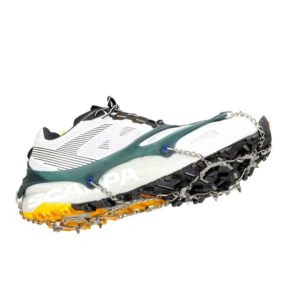 Med 1cm sylskarpe stålpigger gir PRO ekstremt godt feste på alle typer føre – ikke bare på snø og is, men også på barmark. Holdes på plass av kjetting og slitesterk silikon som trekkes utenpå skoen. PRO brukes som ekstra sikkerhet av Forsvaret, Elverket, jegere og andre som går i bratt terreng, vinter som sommer